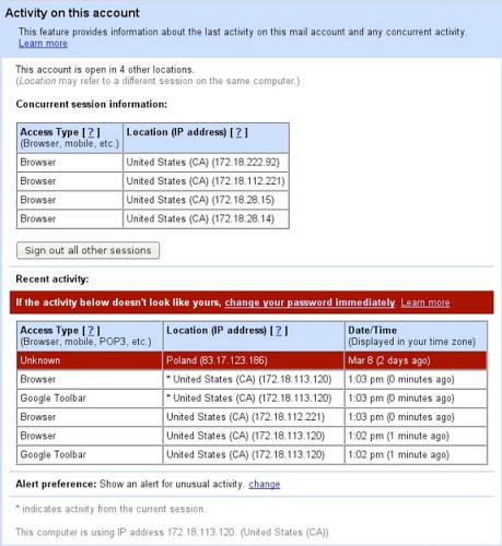 Η Google από εχθές ενεργοποίησε άλλη μια δικλίδα προστασίας για τους λογαριασμούς Gmail. Αυτή την φορά η Google προειδοποιεί για πιθανή χρήση του λογαριασμού σας από τρίτους. Ο καθορισμός μιας τέτοιας παραβίασης γίνεται από τον έλεγχο των IP που συνδέονται στον λογαριασμό σας και διαφόρων άλλων στοιχείων τους όπως για παράδειγμα την γεωγραφική τους θέση.