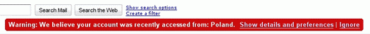 Όπως αναφέρετε και στο Gmail Blog, μια σύνδεση στο Gmail από μια συγκεκριμένη χώρα, ακολουθούμενη από μία άλλη σύνδεση σε μικρό χρονικό διάστημα από μια άλλη χώρα, σίγουρα θα μπορούσε να ενεργοποιήσει την προειδοποίηση . Για να σας βοηθήσει να καθορίσετε και μόνοι σας αν όντως ισχύει κάτι τέτοιο, δίνονται περισσότερες πληροφορίες ακολουθώντας την επιλογή "Show Details", όπως βλέπετε και παρακάτω.