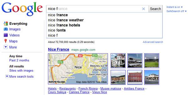 Βέβαια τώρα θα αναρωτιέστε τι αποτελέσματα δείχνει. Αν θυμάστε και παλιότερα όταν πληκτρολογούσατε στο Google, εμφανιζόταν από κάτω μία αναδυόμενη λίστα με προτάσεις για το τι μπορεί να θέλετε να γράψετε. Αυτό ακριβώς γίνεται και τώρα, με τη διαφορά ότι σας εμφανίζει και τα αποτελέσματα της αναζήτησης από την πρώτη πρόταση στη λίστα, χωρίς να χρειαστεί να πατήσετε “enter” ή “search”. Π.χ. αν πατήσετε “nice f”, τότε η πρώτη πρόβλεψη της Google είναι ότι θέλετε να πατήσετε “Nice France” και αυτομάτως σας βγάζει από κάτω φωτογραφίες και links για την Νίκαια στη Γαλλία.