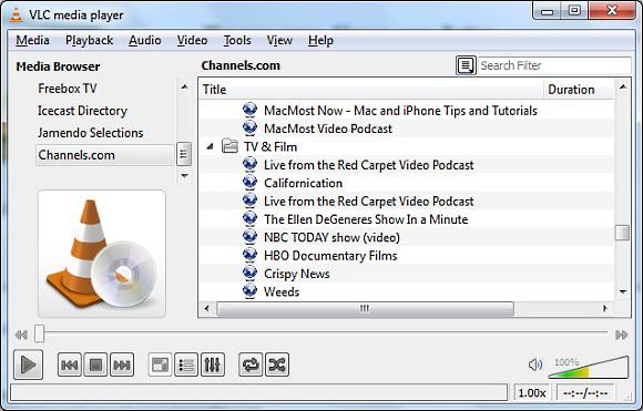 Η δεύτερη μεγάλη αλλαγή που έγινε στην νέα έκδοση, είναι στο παράθυρο της λίστας αναπαραγωγής. Αν κάνετε κλικ στο βέλος που αναγράφει "Internet" στο Media Browser, θα δείτε και το Channels.com. Το Channels.com προσφέρει μια μεγάλη γκάμα από streaming εκπομπές, και το VLC σας προσφέρει μερικές απο αυτές, σε αριθμό 1000.