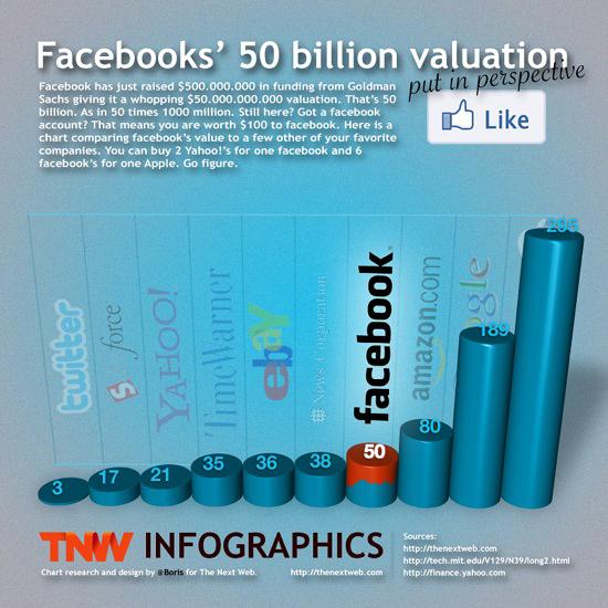 Αν έχετε διαβάσει για τη νέα αποτίμηση των $50δις του Facebook σήμερα το πρωί, το παραπάνω γραφικό σας λέει σίγουρα πολλά. Με βάση λοιπόν τη τελευταία αποτίμηση του, το Facebook αξίζει 16 φορές περισσότερο από το Twitter, ενώ κάποιος με αυτά τα χρήματα θα μπορούσες να αγοράσει το Twitter, τη SalesForce και τη Yahoo! και να του μείνουν και ορισμένα... ψιλά!