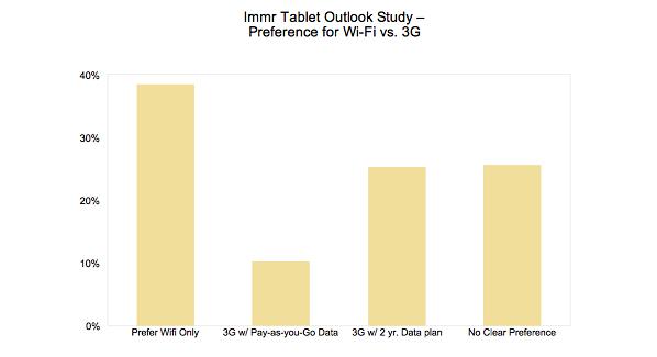 Σχετικά με το αν οι καταναλωτές θα επιλέγανε μεταξύ WiFi ή 3G για το tablet τους, κερδίζει το "μόνο WiFi" με ποσοστό κοντά στο 40%, ακολουθούν τα "δεν επιθυμώ κάτι συγκεκριμένο" και "3G με 2 χρόνια data plan" με ποσοστά κοντά στο 25% και τελευταίο το "3G χωρίς κάποιο data plan" με περίπου 10%.