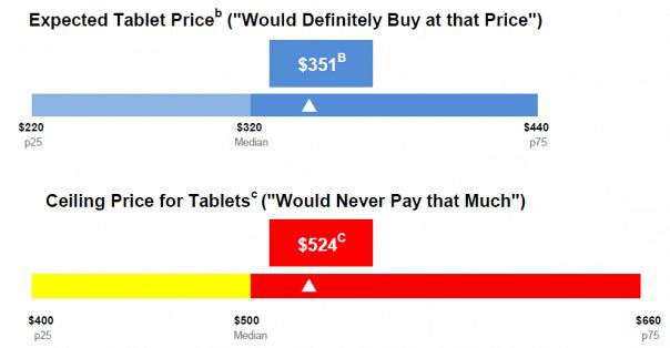Τα ποσά που αναφέρονται στα αποτελέσματα της έρευνας κυμαίνονται μεταξύ $351 και $524. Παρατηρούμε πως αυτά είναι χαμηλότερα από την τιμή πολλών tablets που κυκλοφορούν. Το ποσό των $351 αντιστοιχεί στο "θα αγόραζα οπωσδήποτε αυτό το tablet", ενώ το $524 αντιστοιχεί στο άνω όριο που έθεσαν οι ερωτηθέντες, σχετικά με το μέχρι πόσα θα έδιναν. Το 38% των ερωτηθέντων ενδιαφέρονται αρκετά ή πολύ να αγοράσουν ένα tablet, κάτι που δικαιολογεί το χαμηλό σύνολο χρημάτων που προτίθεται να δαπανήσει κάποιος, αφού το υπόλοιπο 62% δεν σκοπεύει (ή ενδιαφέρεται λίγο) να αγοράσει κάποιο tablet.