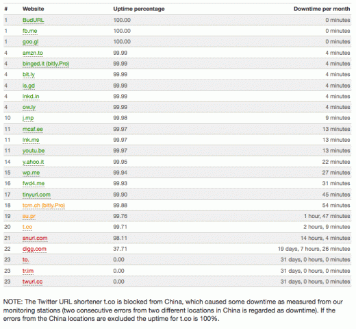 Μετρώντας για ένα μήνα, το πόσο πολύ ήταν διαθέσιμοι 25 από τους πιο γνωστούς URL shorteners, η έρευνα έδειξε πως μόνο 3 από αυτούς είχαν 100% επιτυχία, το BUDurl, το FB.me του Facebook και το Goo.gl της Google. Κάποιες υπηρεσίες όπως η Bit.ly ή η J.mp ήταν πεσμένες για μερικά λεπτά, ενώ άλλες όπως το Tinyurl.com δεν ήταν διαθέσιμες για κοντά 1 ώρα. Το πιο αποητευτικό αποτέλεσμα έρχεται από την υπηρεσία του Digg, η οποία ήταν κάτω για περίπου 20 μέρες στη διάρκεια του μήνα.