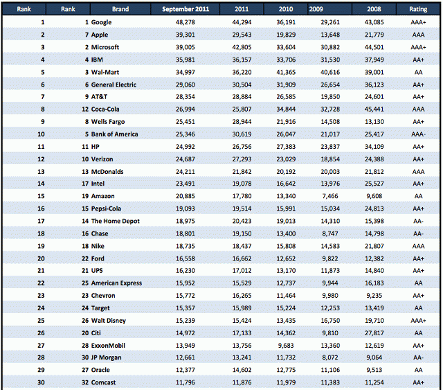 Το 2011 κρίνεται ως πολύ επιτυχημένο για την Apple, αφού μέσα σε αυτούς τους 9 μήνες η αξία του brand της αυξήθηκε κατά 33% φτάνοντας τα $39,3 δις, με αποτέλεσμα να σκαρφαλώσει για πρώτη φορά από την 7η στην 2η θέση της λίστας που δημιούργησε η αγγλική Brand Finance. Η εταιρεία αυτή ελέγχει την ροή ρευστού και διάφορες άλλες μετρικές που έχουν να κάνουν με την οικονομία, με σκοπό να υπολογίσει την αξία των trademarks και άλλων πνευματικών ιδιοκτησιών που έχουν οι εταιρείες. Στην λίστα που δημοσίευσε αυτόν τον μήνα, την πρώτη θέση συνεχίζει να καταλαμβάνει η Google, με την αξία του brand της να φτάνει τα $48,3 δις.