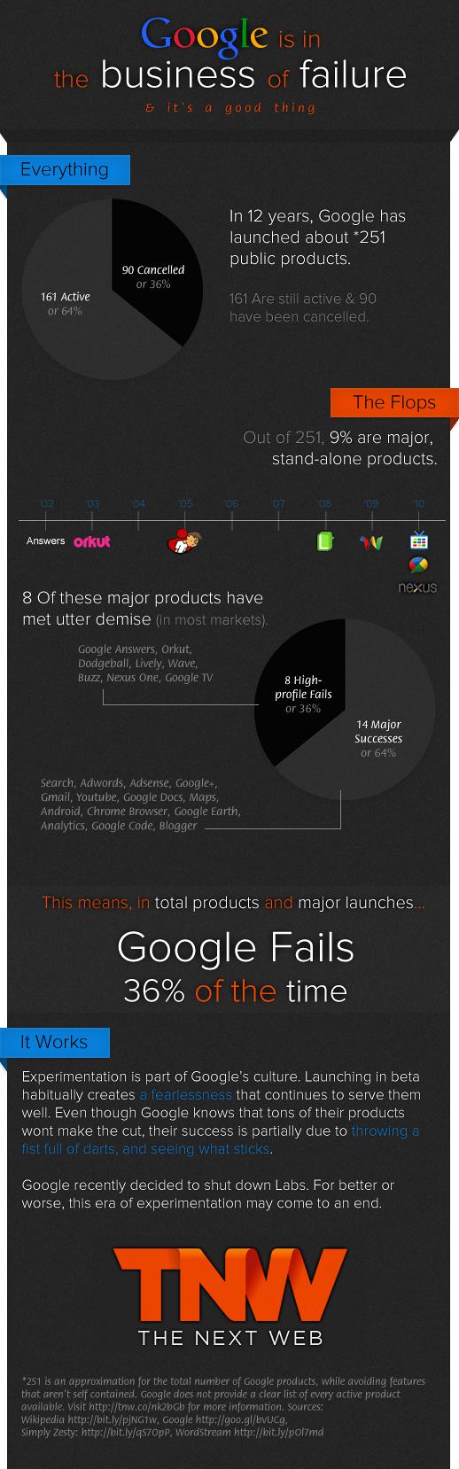 Από αυτά τα 251 projects, η Google έχει αποφασίσει να ακυρώσει τα 90, δηλαδή περίπου το 36% από αυτά. Το ποσοστό ίσως να φαίνεται μεγάλο, όμως αυτή η τάση της Google να δοκιμάζει τόσες πολλές νέες ιδέες είναι εκείνη που ευθύνεται για την επιτυχία της εταιρείας μέχρι σήμερα. Επιπλέον, επιλέγοντας κάθε φορά να προσφέρει την beta έκδοση των projects αυτών για να την δοκιμάσει ο κόσμος, γλυτώνει (τις περισσότερες φορές τουλάχιστον) από τα αρνητικά σχόλια των media όταν κάποια από αυτά τα projects αποτυγχάνουν. Αντίθετα, εταιρείες όπως η Apple που δεν ακολουθεί την ίδια τακτική, τείνουν να είναι πιο ευάλωτες σε πιθανές αποτυχίες των προϊόντων που δημιουργούν.