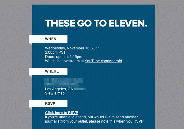 Ένα από τα πράγματα που η Apple ξέρει να κάνει καλά, είναι να δημιουργεί "θόρυβο" πίσω από τα events που διοργανώνει. Αυτήν την ικανότητα φαίνεται πως αποκτάει και η Google, η οποία μας έδωσε πολλά στοιχεία για ένα event που θα διοργανώσει στις 16 Νοεμβρίου στο Los Angeles, χωρίς όμως αυτά να είναι αρκετά για να βγάλουμε συμπεράσματα για το θέμα της εκδήλωσης. Το event ονομάζεται "These Go to Eleven", το οποίο είναι μία φράση από το mockumentary (ένα ντοκιμαντέρ που αναφέρεται σε φανταστικά γεγονότα) "This is Spinal Trap" του 1984.