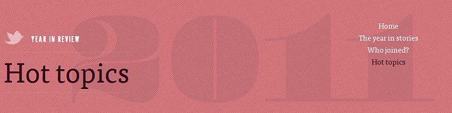 Κατά τη διάρκεια του 2011 οι χρήστες του Twitter ασχολήθηκαν με πολλά θέματα, άλλα πιο σοβαρά, όπως η επανάσταση που έγινε στην Αίγυπτο ή ο καταστροφικός σεισμός στην Ιαπωνία μαζί με όλα τα επακόλουθα του, και άλλα πιο χαλαρά, όπως ο ερχομός του Ashton Kutcher στον πρωταγωνιστικό ρόλο του Two And A Half Men ή η Rebecca Black και το τραγούδι Friday. Από όλα αυτά τα θέματα, λίγα είναι εκείνα που κατάφεραν να διακριθούν στην κατηγορία τους. Το Twitter δημοσίευσε μία μινι-ανασκόπηση της χρονιάς που ολοκληρώνεται σε λίγες βδομάδες, την οποία σας παρουσιάζουμε.