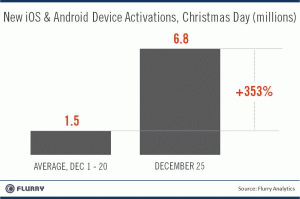 Για να συνειδητοποιήσετε το μέγεθος της αύξησης, σας αναφέρουμε πως οι ενεργοποιήσεις κινητών τηλεφώνων ανά ημέρα για το πρώτο 20ήμερο του Δεκεμβρίου ξεκινούσαν από τα 1,3 εκατομμύρια και έφταναν μέχρι τα 1,8 εκατομμύρια. Σύμφωνα με ένα tweet του Andy Rubin, Senior Vice President στην Google και επικεφαλής του Android, η Google κατέγραψε 3,8 εκατομμύρια ενεργοποιήσεις συσκευών Android αυτό το διήμερο. Παρόλο που δεν αναμένεται κάποιο στέλεχος της Apple να ανακοινώσει τα στατιστικά για το iOS, αν τα δεδομένα της Flurry ισχύουν, τότε οι καταναλωτές αγόρασαν 3 εκατομμύρια iPhones/iPod Touches/iPads.
