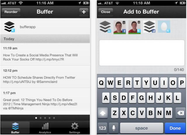 Το Buffer είναι το application που δίνει λύση στην απουσία του χρήστη από το twitter. Μαζεύεις tweets που θες να μοιραστείς, τα τοποθετείς σε σειρά στο buffer, τα προγραμματίζεις ως προς την ώρα δημοσίευσης και έτσι δεν "λείπεις" ποτέ από το timeline των λογαριασμών που σε ακολουθούν. Λειτουργεί όπως και τα προγραμματισμένα blog posts. Εκτός από application για τον browser, το buffer είναι διαθέσιμο στο App Store και Android Market.