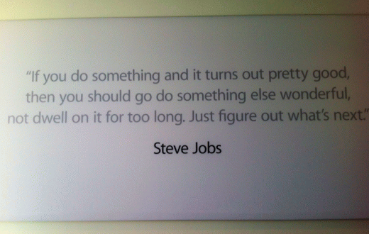 Η παρακάτω φωτογραφία είναι ένα παράδειγμα αποφθέγματος, το οποίο είχε αναφέρει και ο νυν CEO της εταιρείας, Tim Cook, κατά τη διάρκεια της εκδήλωσης μνήμης του Steve Jobs που είχε γίνει στα κεντρικά γραφεία της Apple. Είναι αρκετά γνωστό για όσους γνωρίζουν κάποια πράγματα για τον Steve Jobs και τη φιλοσοφία του.