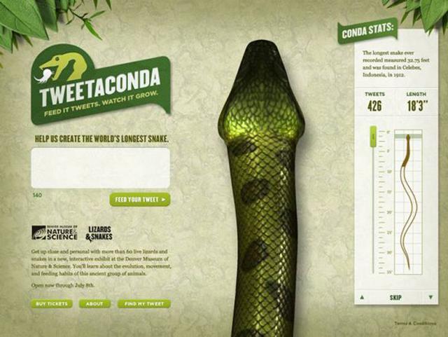 Η ιδέα άρχισε από το μουσείο Φυσικής και Επιστήμης του Denver και την εταιρία Carmichael Lynch. Για να υποστηρίξουν τη νέα τους έκθεση με θέμα "Σαύρες & Φίδια" και με στόχο να ενημερώσουν, προσελκύσουν και κινητοποιήσουν το κοινό αλλά παράλληλα να κερδίσουν δημοσιότητα σχετικά με το αντικείμενό τους, σχεδίασαν το Tweetaconda. Όσο περισσότερο tweetάρουμε με hashtag το #tweetaconda, αυτό τρέφεται και μεγαλώνει.