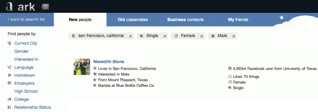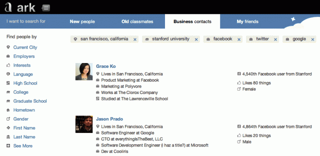 Αντί να πληκτρολογούμε το όνομα του ανθρώπου που θέλουμε να βρούμε, στο Ark επιλέγουμε άλλα χαρακτηριστικά, όπως η τρέχουσα πόλη διαμονής, οι εργοδότες του, το επίπεδο εκπαίδευσης, το φύλο, γενικά ενδιαφέροντα και άλλα πολλά. Τα αποτελέσματα που δίνει η αναζήτηση εμφανίζονται με τέτοιο τρόπο ώστε να μη χρειάζεται να ανοίγουμε πολλές σελίδες για να βρούμε αυτό που θέλουμε. Για παράδειγμα, δίπλα σε κάθε όνομα εμφανίζονται συνοπτικές πληροφορίες για αυτό το άτομο, και αν μας ενδιαφέρει κάποιος περισσότερο, τότε θα πατήσουμε πάνω του για να δούμε ό,τι είναι διαθέσιμο.