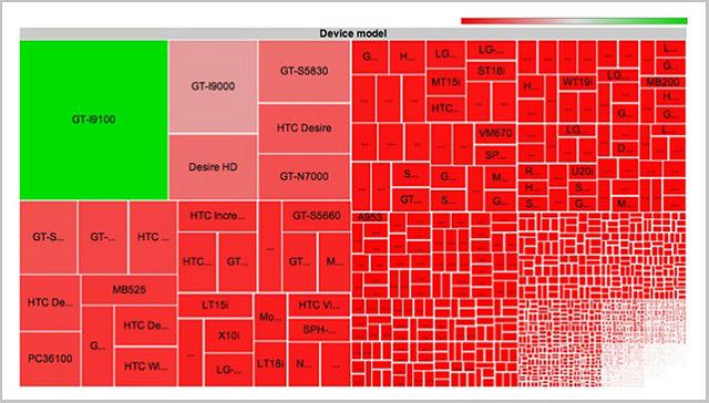 Παράλληλα με το όνομα της συσκευής, η εταιρεία κατέγραψε και την ανάλυση της οθόνης. Τα αποτελέσματα της έρευνας τα βλέπετε παραπάνω. Είναι εκπληκτικό το πόσες αναλύσεις πρέπει να λάβει κάποιος υπόψιν του αν θέλει να αναπτύξει κάποια εφαρμογή για Android και αν παράλληλα θέλει αυτή η εφαρμογή να λειτουργεί ιδανικά σε κάθε συσκευή. Τελικά, αν υπολογίσουμε το πόσο δημοφιλής είναι κάθε ανάλυση, μπορούμε να μειώσουμε το πλήθος σε 13 διαφορετικές αναλύσεις, αριθμός αρκετά πιο χαμηλά από τον αρχικό. Οπότε λαμβάνοντας υπόψιν αυτές τις 13 αναλύσεις οθόνης, καλύπτουμε μία μεγάλη πλειοψηφία των κατόχων συσκευών Android.